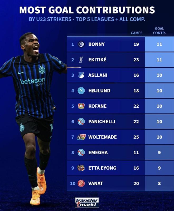 本賽季五大聯(lián)賽U23前鋒直接參與進球數(shù)前10: